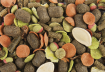 Složení: výrobky rostlinného původu (seno 18%, vojtěška 12%, chléb svatojánský 4,7%), semena, ovoce, zelenina