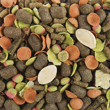 Složení: výrobky rostlinného původu (seno 18%, vojtěška 12%, chléb svatojánský 4,7%), semena, ovoce, zelenina