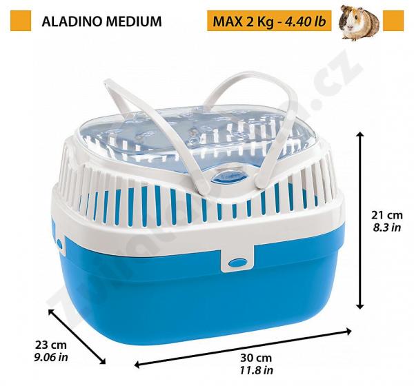 Přepravky Aladino jsou k dispozici ve třech různých velikostech. Aladino Small se doporučuje pro křečky, Aladino Medium je ideální pro morčata, Aladino Large je vhodný pro králíky.
